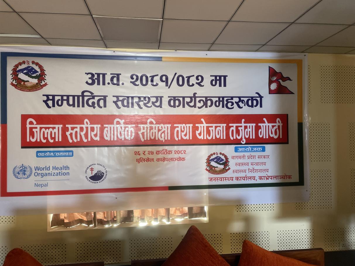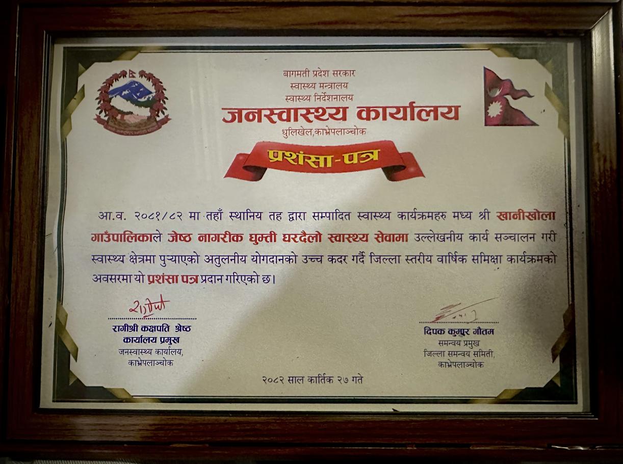 जिल्ला स्तरीय वार्षिक समिक्षा कार्यक्रमको अवसरमा जिल्ला समन्वय समितिको कार्यालय, काभ्रेपलाञ्चोकका जिल्ला समन्वय प्रमुख श्री दिपक गौतमज्यूद्वारा प्रशंसा पत्र प्रदान गर्दाको झलक