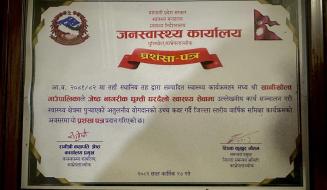 जिल्ला स्तरीय वार्षिक समिक्षा कार्यक्रमको अवसरमा जिल्ला समन्वय समितिको कार्यालय, काभ्रेपलाञ्चोकका जिल्ला समन्वय प्रमुख श्री दिपक गौतमज्यूद्वारा प्रशंसा पत्र प्रदान गर्दाको झलक