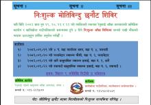 "यही पुष १९,२०, २१ र २२ गतेसम्म ४ दिन हुन गइरहेको नि:शुल्क मोतिविन्दु छनौट शिविरमा आफ्नो पायक पर्ने स्थानमा गइ सुनौलो अवसरको मौकाको फाइदा उठाउनु हुन सम्बन्धित सबैमा जानकारीको लागि सूचना प्रकाशन गरिएको छ"