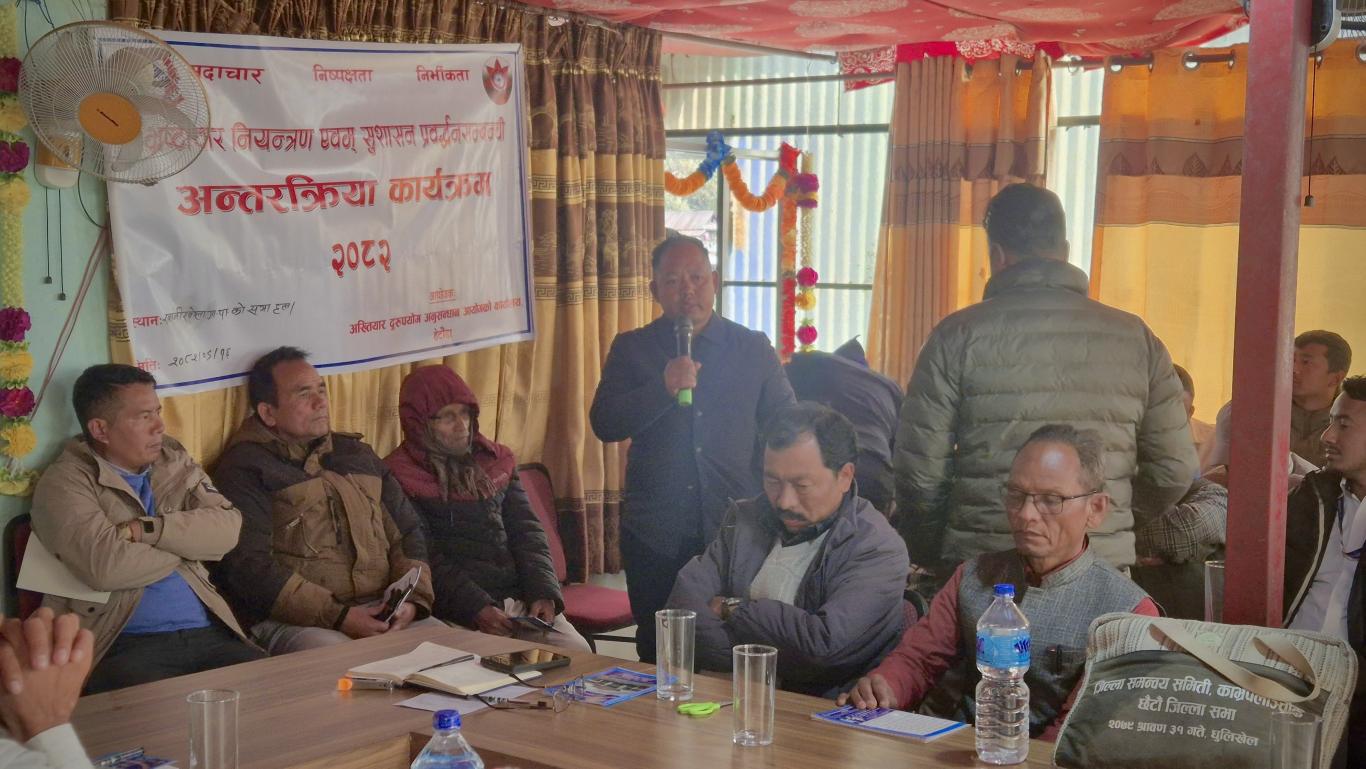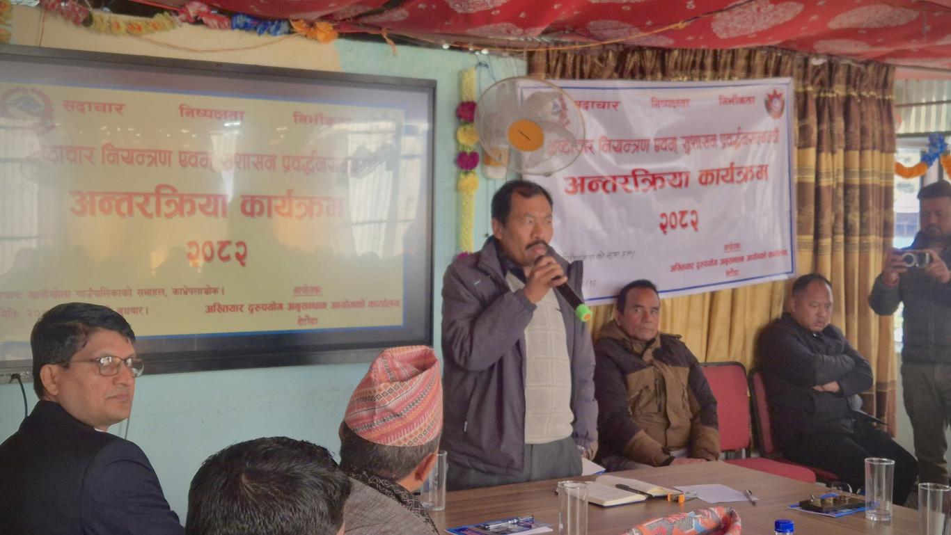 अख्तियार दुरुपयोग अनुसन्धान आयोगको कार्यालय, हेटौंडाको आयोजनामा आज मिति २०८२।०९।१६ गते बुधबारका दिन खानीखोला गाउँपालिकाको सभाहलमा सञ्चालन भएको "भ्रष्टाचार नियन्त्रण एवम् सुशासन प्रवर्द्धन" विषयक अन्तरक्रिया कार्यक्रममा गाउँपालिकाका अध्यक्ष श्री ईन्द्र बहादुर थिङज्यूको आतिथ्यतामा साथै खानीखोला गाउँपालिकाका उपाध्यक्ष श्री दोर्जेमान जिम्बाज्यू र प्रमुख प्रशासकीय अधिकृत श्री राम कुमार तिमल्सेनाज्यूको विशेष उपस्थितिमा तथा गाउँसभाका सदस्यज्यूहरु, विभिन्न वडाका वडाध्यक्षज्यूहरु, गाउँपालिकाका शाखा प्रमुखस्तरका कर्मचारीहरु, गाउँपालिकास्थित माध्यामिक विद्यालयका वि.व्य.स.का अध्यक्षज्यूहरु र प्रधानाध्य