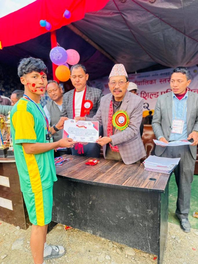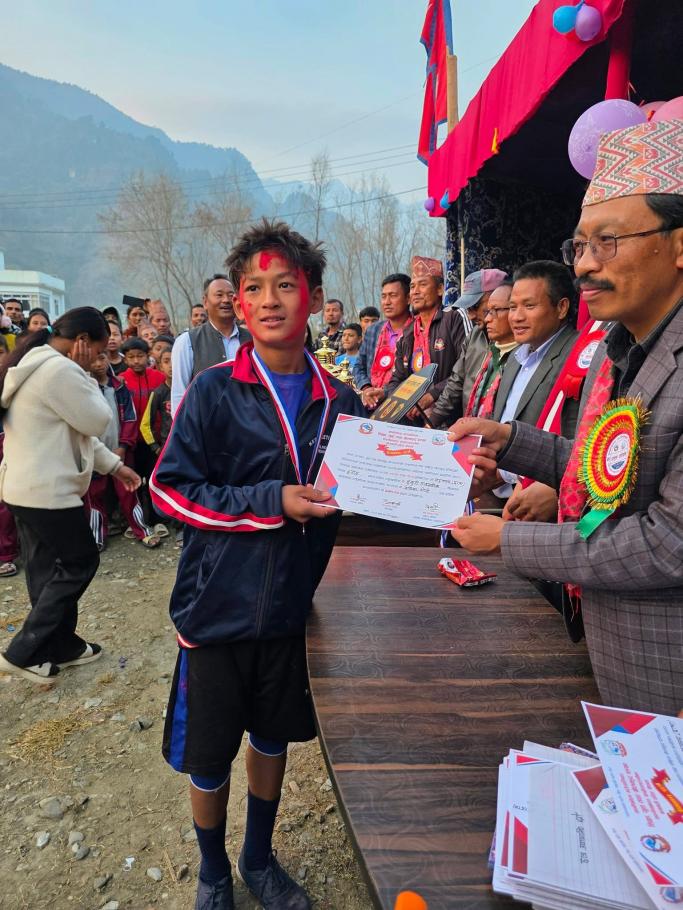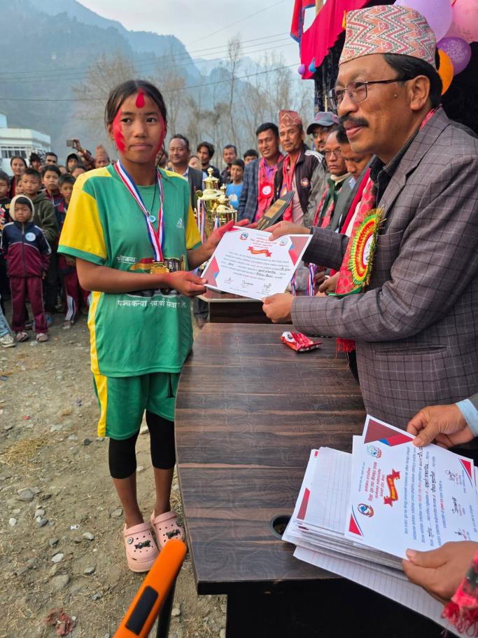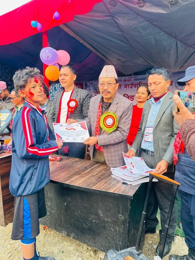 आज मिति २०८२ साल माघ १४ गतेका दिन यस खानीखोला गाउँपालिकाको आर्थिक सहयोग र श्री जन विकास माध्यमिक विद्यालय, ताल्ढुङ्गाको आयोजनामा गाउँपालिका स्तरिय पाँचौ रास्ट्रपति रनिङ शिल्ड प्रतियोगिता गाउँपालिकाका अध्यक्ष श्री ईन्द्र बहादुर थिङज्यूको प्रमुख आतिथ्यतामा सहभागी सम्पूर्ण विद्यालयहरू सहित प्रतियोगिता शानदार ढंगले सम्पन्न गर्ने आयोजक विद्यालय श्री जनविकास मा.वि. लाई धेरै धेरै धन्यबाद ज्ञापन गर्दै विभिन्न खेलमा विजेता हुनु भएकाहरूलाई पुरस्कार वितरण गरेर कार्यक्रम समापन गर्दाको झलक |